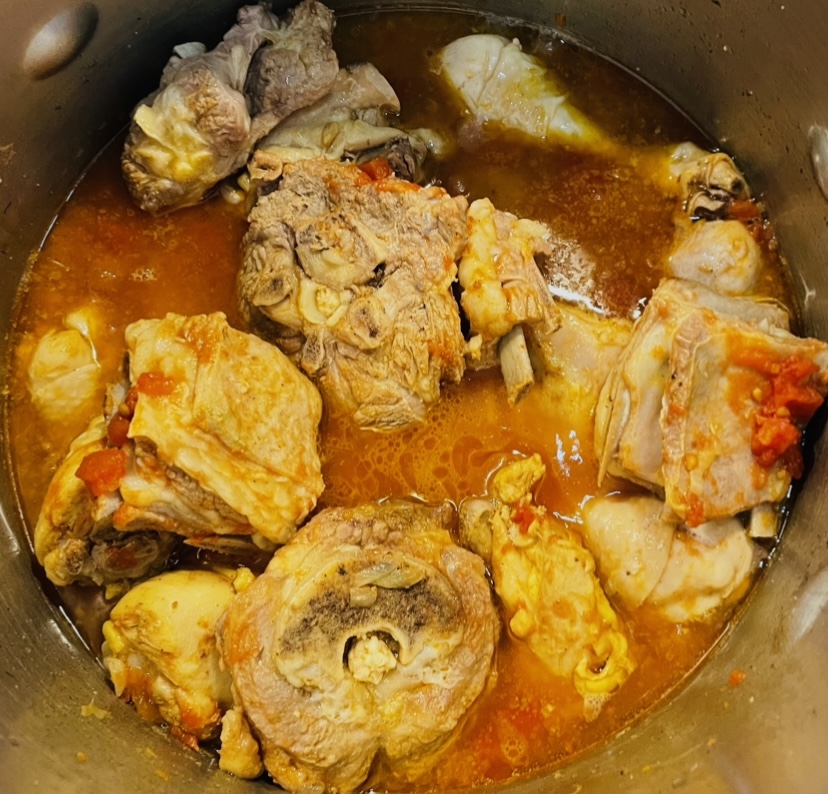 2. Rajouter ensuite les épices (mélange de piment de Cayenne , coriandre, curcuma, cumin, safran, carvi, sel et poivre) ainsi qu’une boîte de concassé de tomates afin d’enrichir le jus.